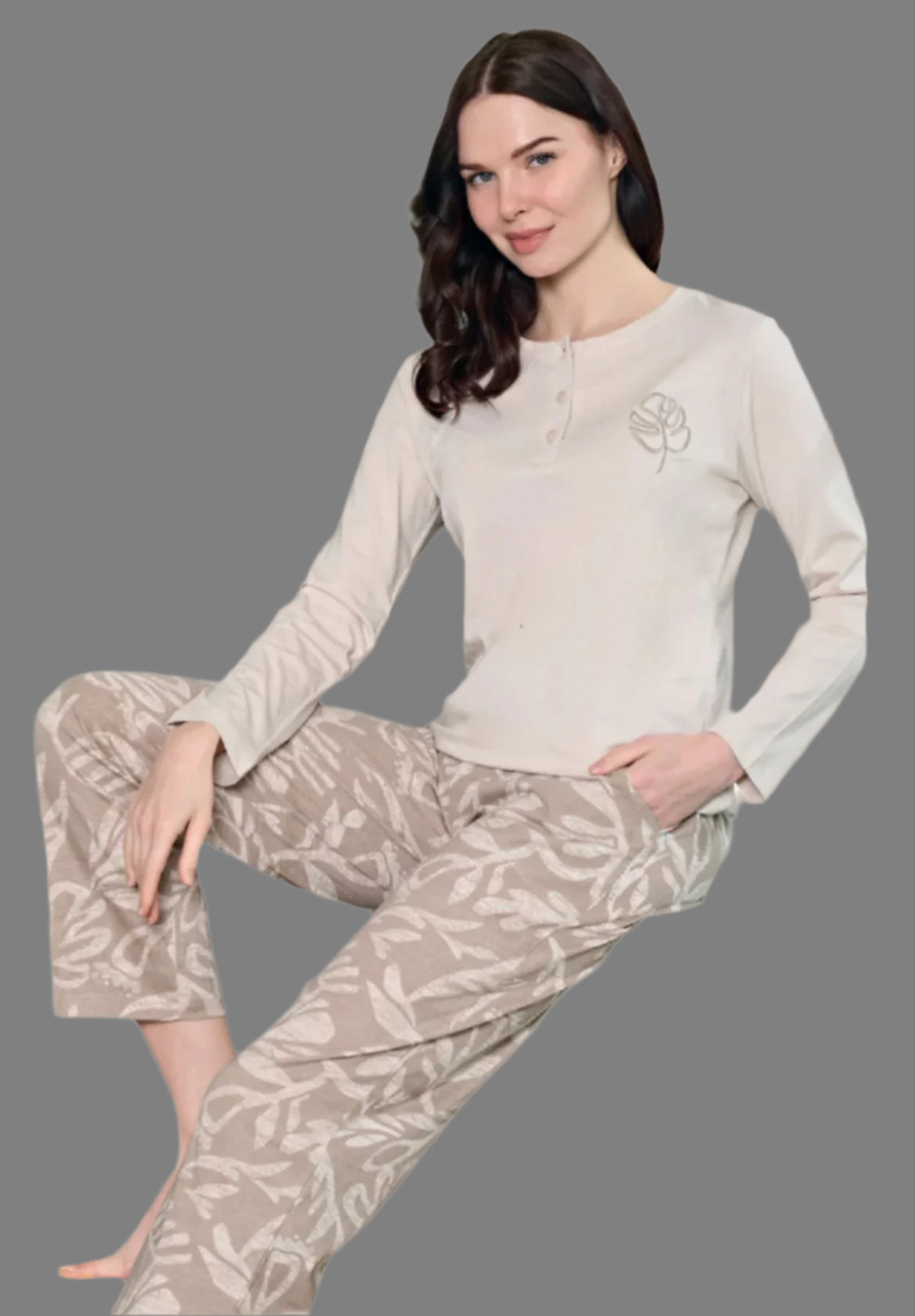 Uživaj v popolnem udobju z lahkotno poletno pižamo iz 100 % česanega bombaža. Mehka, zračna in nežna do kože – popolna izbira za tople noči. Klasičen kroj omogoča udobno prileganje, naravni materiali pa poskrbijo za svež občutek skozi vso noč.